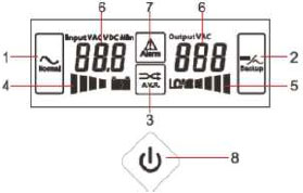Modalità rete, modalità AVR, modalità batteria, livello batteria, livello carico,